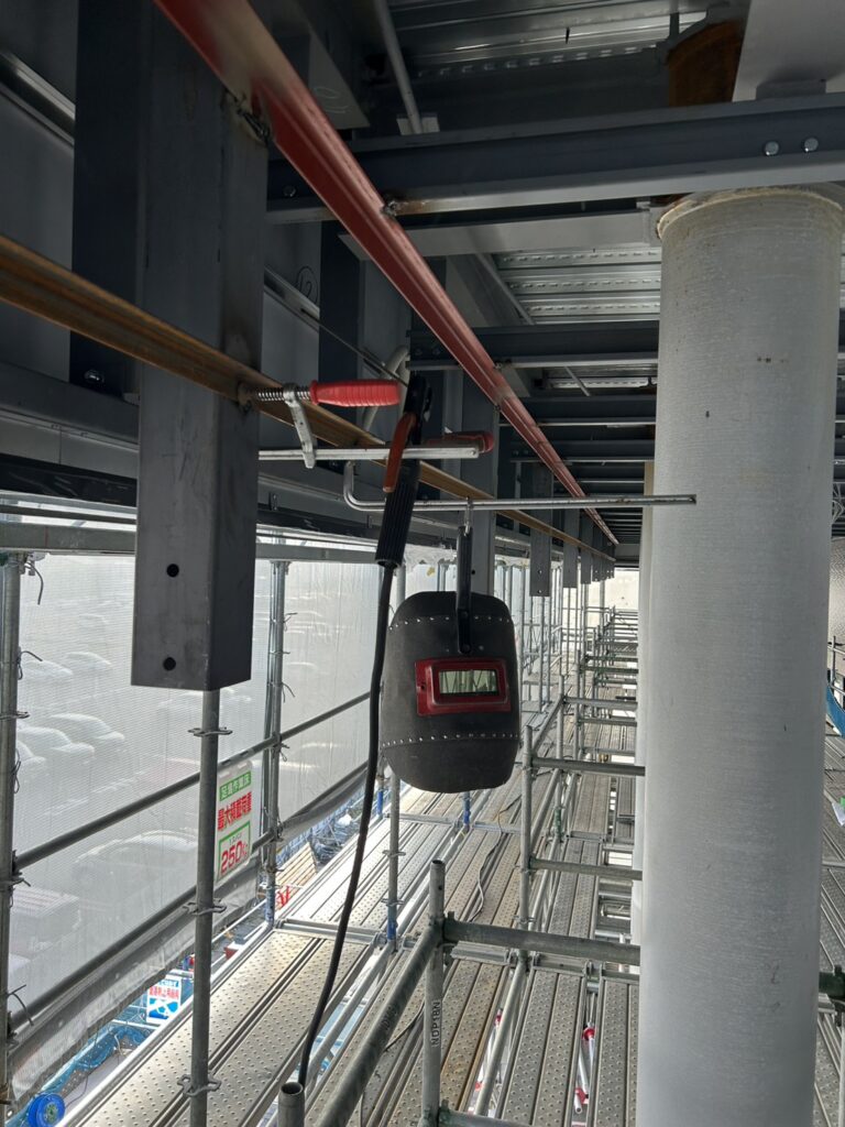 店舗新築工事現場にて、店舗吊看板下地の溶接取り付けを行いました。